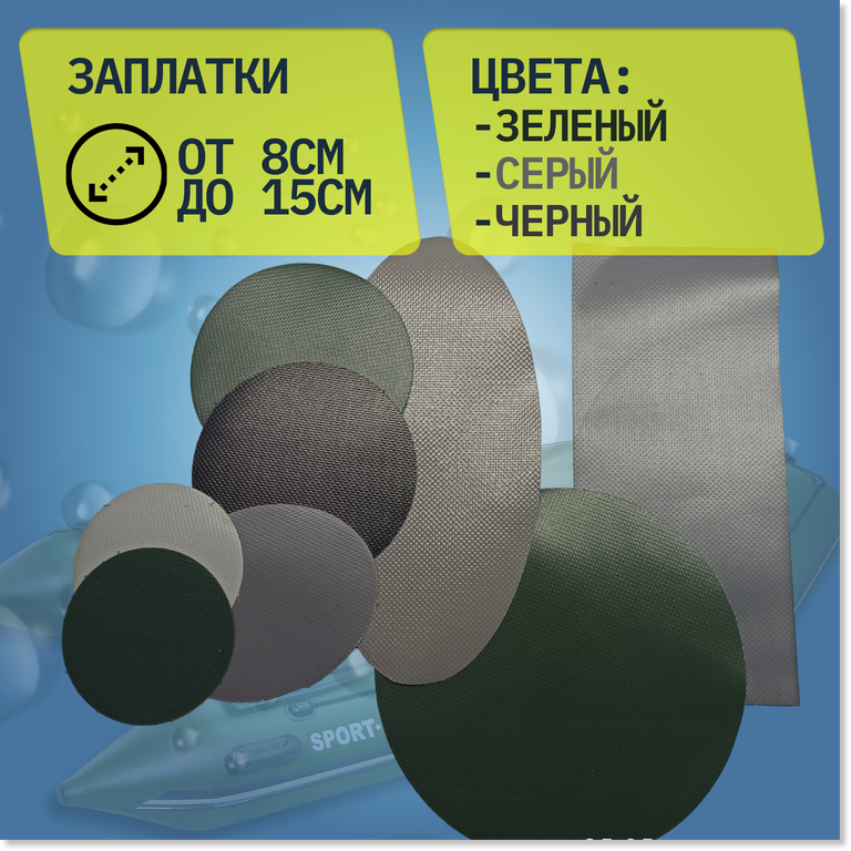 4. Заплатки ПВХ-ткань 8 шт. (зеленые, серые, черные разных размеров)