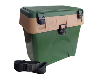 На внешней стороне ящика A-elita A-Box закреплен широкий ремень переменной длины и плечевым амортизатором с противоскользящими свойствами. Материалом для его изготовления служит прочная строповая ткань. Вместе с надежным креплением обеспечит уверенное и комфортное подвешивание полностью загруженного кейса на плече. По бокам монтируются подвесной карман большого объема и откидной столик с ограждением. Дополнительные опции обеспечат доступность необходимых предметов в режиме "под рукой", и комфортную работу со снастью. На лицевой стороне крышки размещен круглый термометр для контроля наружной температуры.