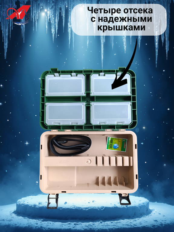 Конструктивно ящик A-elita A-Box состоит из трех основных элементов: главный отсек, промежуточная полка и многофункциональная крышка. Основная емкость больших размеров предназначена под габаритные предметы, может использоваться для размещения крупных пластиковых контейнеров и боксов с приманками. Отсек разделен съемной перегородкой на две половины. Над емкостью, на подвижных шарнирах закреплена полка, разделенная на три отсека с жесткими перегородками. Предусмотренный вырез в корпусе с размерами под кисть, открывает быстрый доступ к содержимому нижнего отсека. Крышка с внутренней стороны оборудована четырьмя контейнерами с крышками из прозрачного пластика и надежными типовыми защелками. На внешней стороне нанесена пенополиэтиленовая подушка. Материал прочно посажен на клей, не чувствителен к влаге, не деформируется, бережет тепло, при необходимости легко чистится.